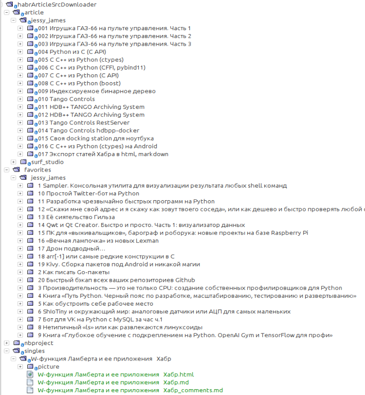 Создается папка article, favorites или singles, далее папка с именем пользователя, далее папки с названиями статей. В папке со статьей будет два файла (.md и .html) и папка с картинками статьи.