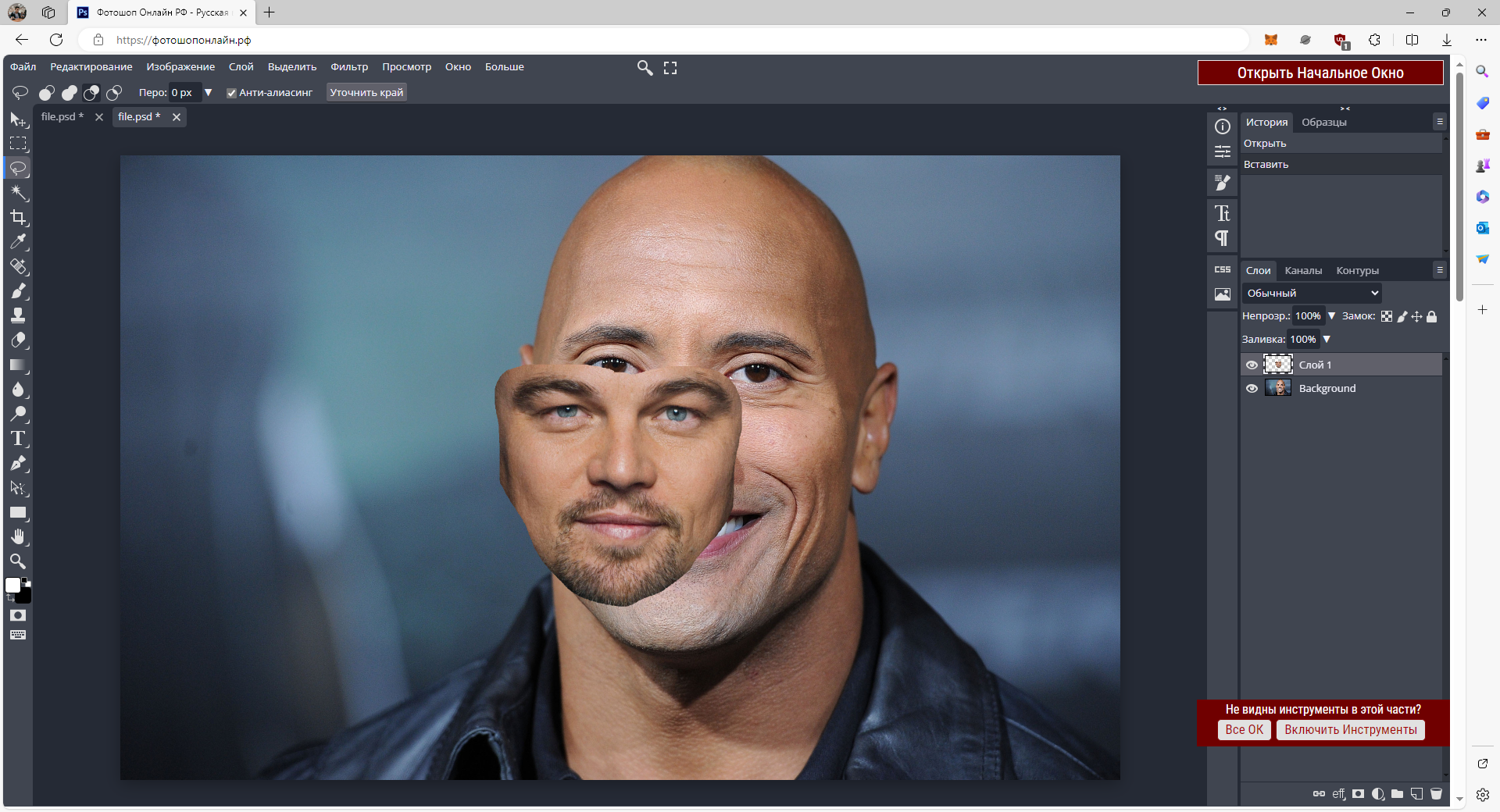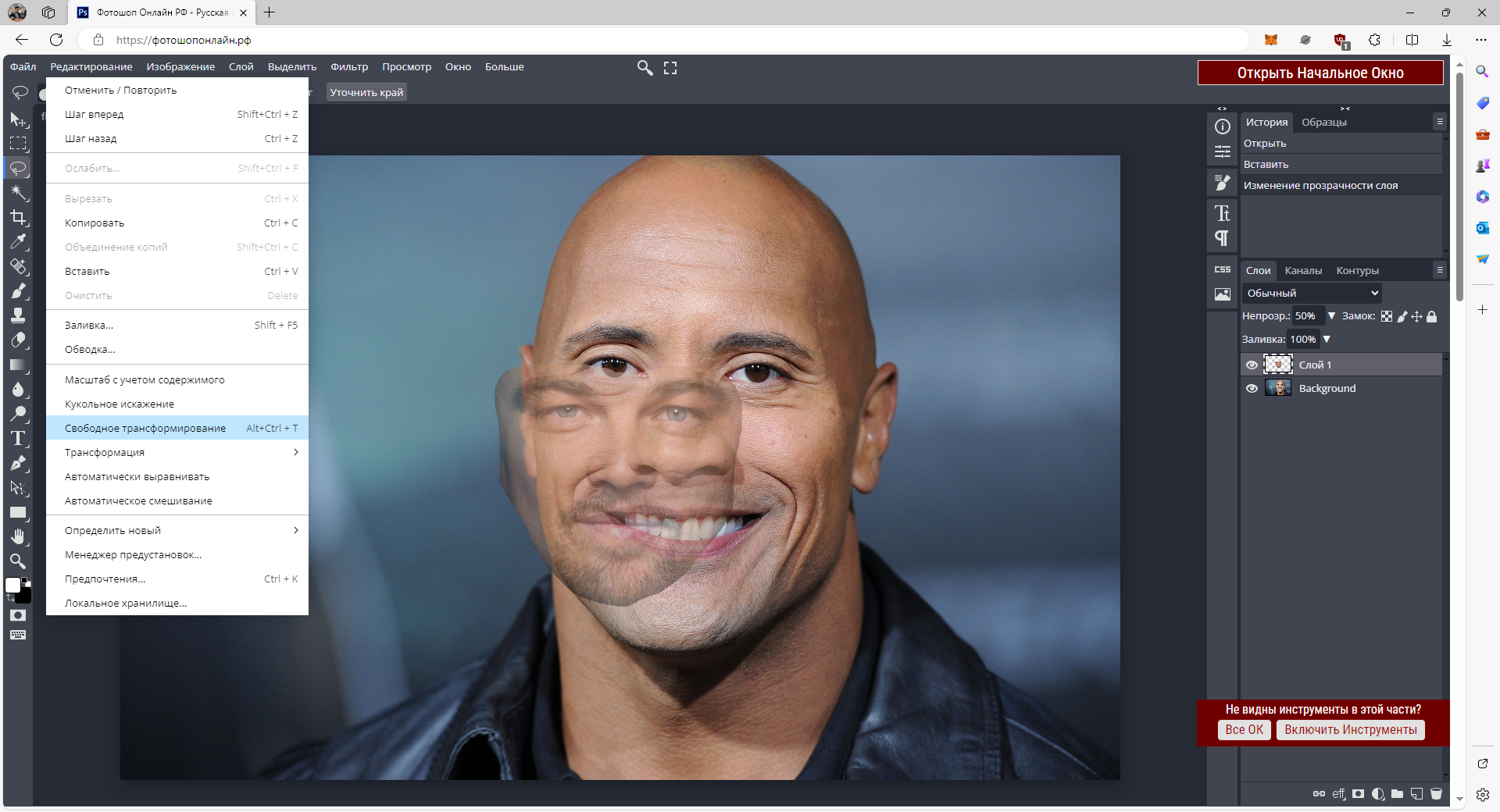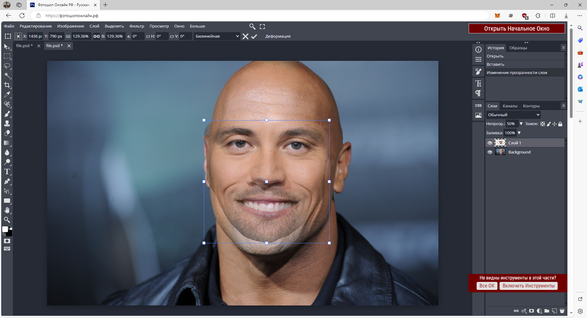 Теперь надо изменить размер лица Ди Каприо так, чтобы его глаза совпали с глазами Скалы.