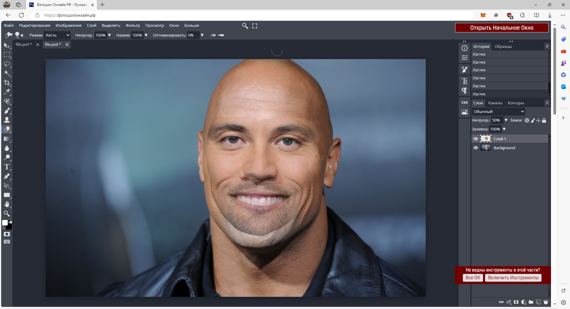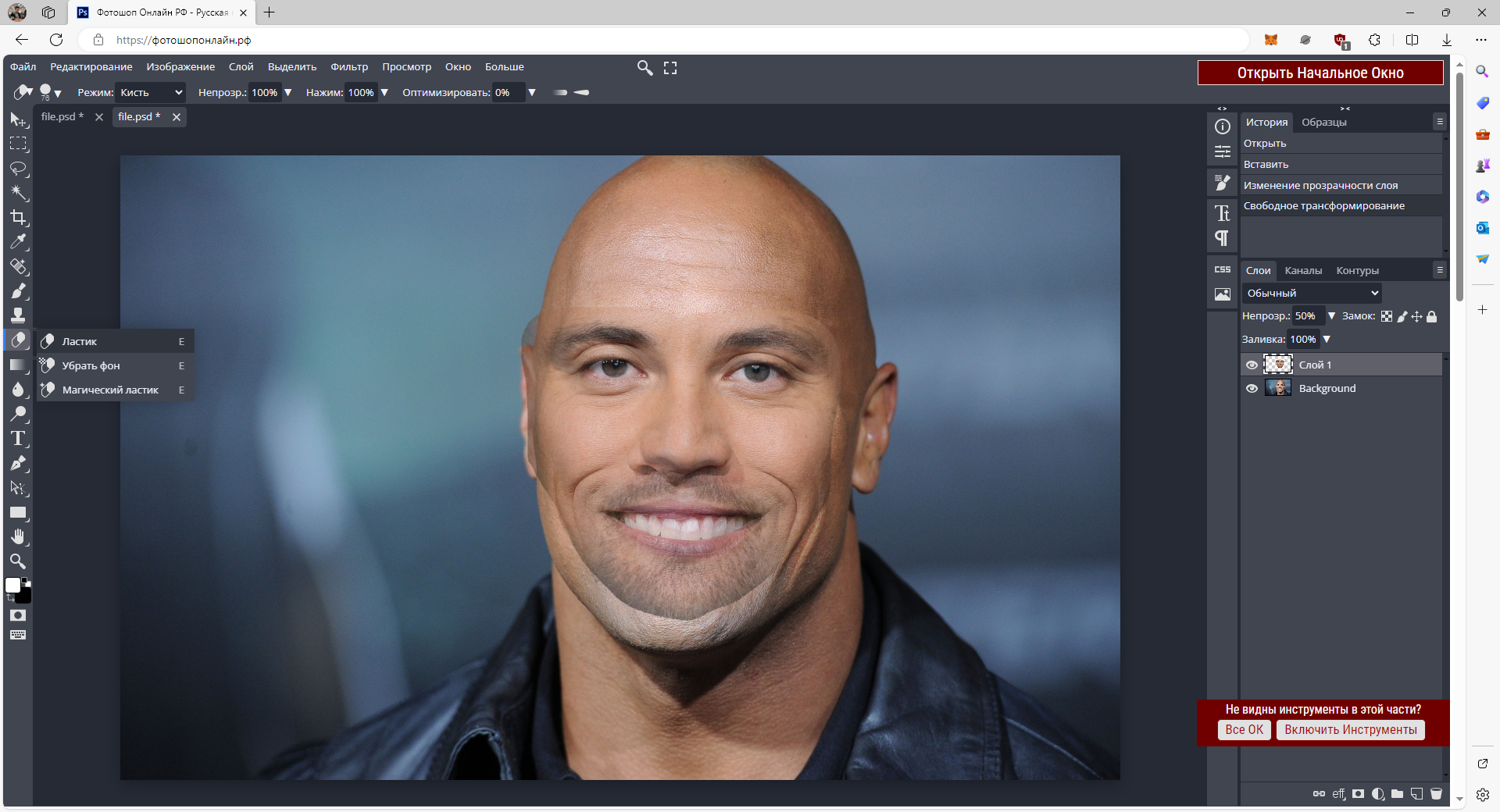 Теперь ластиком убираем выпирающие части лица. (Можно убрать зону ушей). Убрать бороду, или наоборот, оставить её. Самое главное - лицо Ди Каприо не должно быть больше лица Скалы.